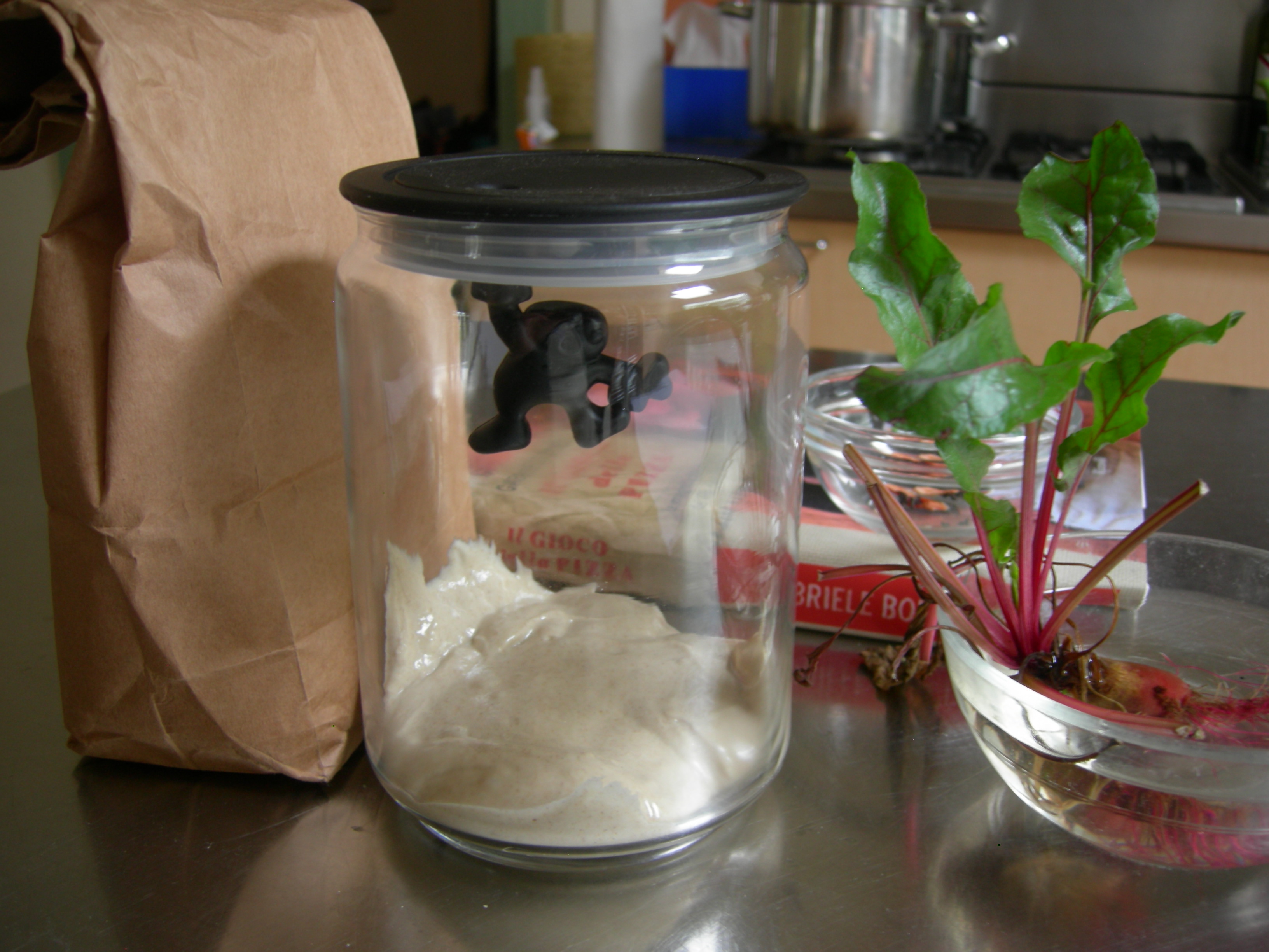 Prepare the starter by dissolving the leaven in the spring water in a 1 litre jug. Vigourously stir in the flours, cover with plastic wrap and leave at room temperature for 24 hours.