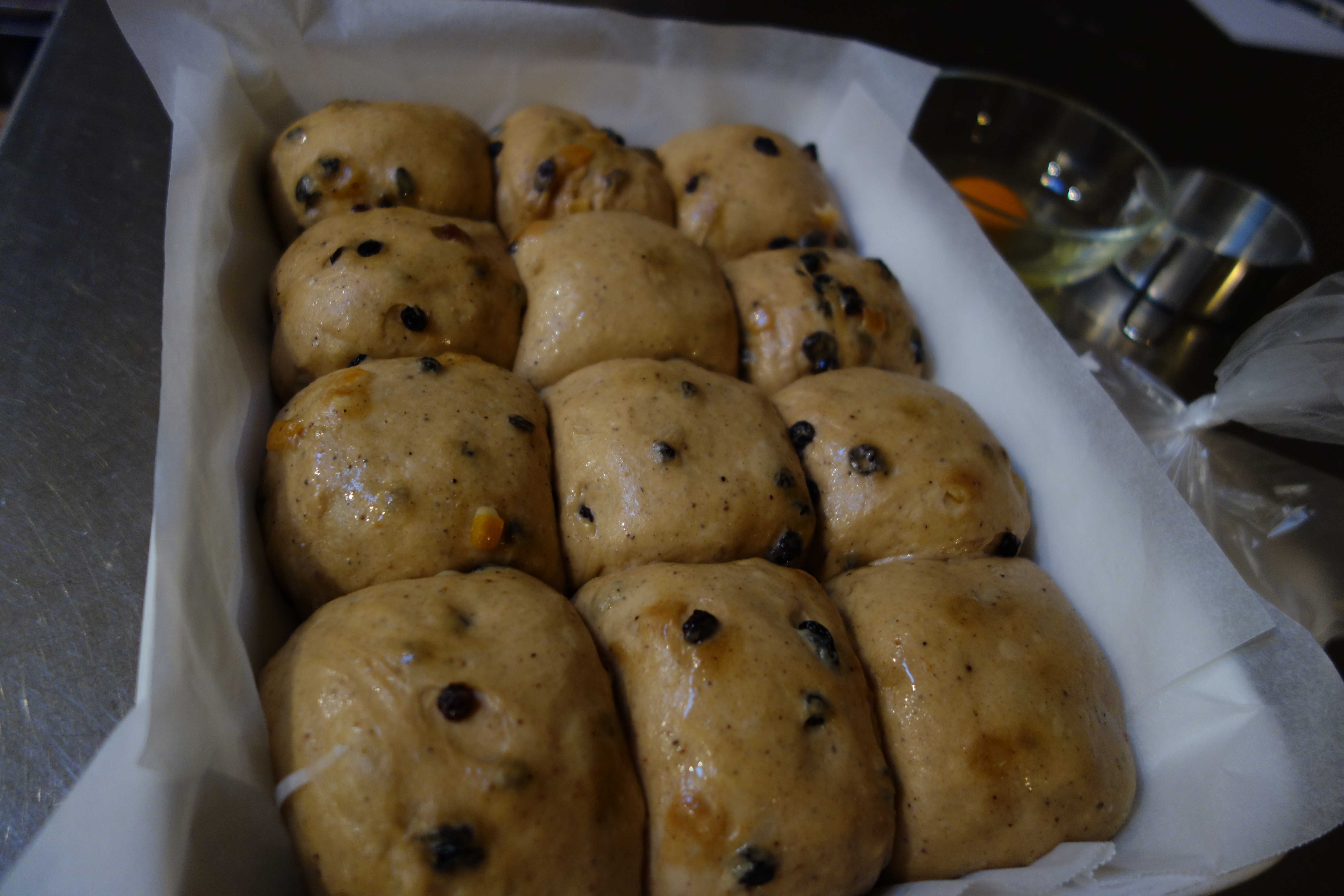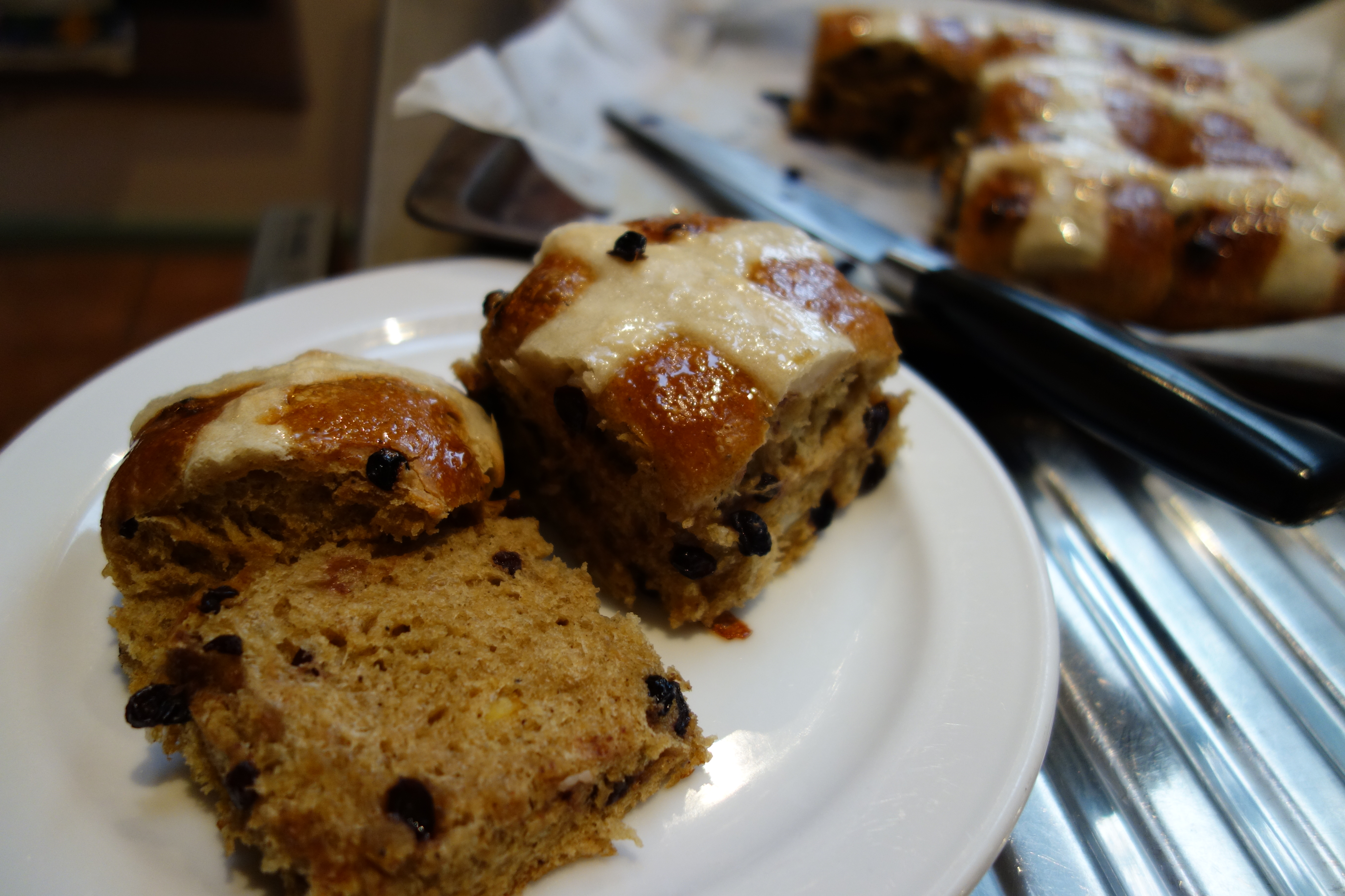 Preheat oven to 190°C. Make a paste with the flour, a grind of salt, and tablespoon or so of cool water. Brush buns with egg wash, then pipe crosses over. Bake for 25-30 minutes until golden. Lift the buns out of their dish about 15 minutes into the baking time onto a metal tray to be sure that the buns are browning evenly. |