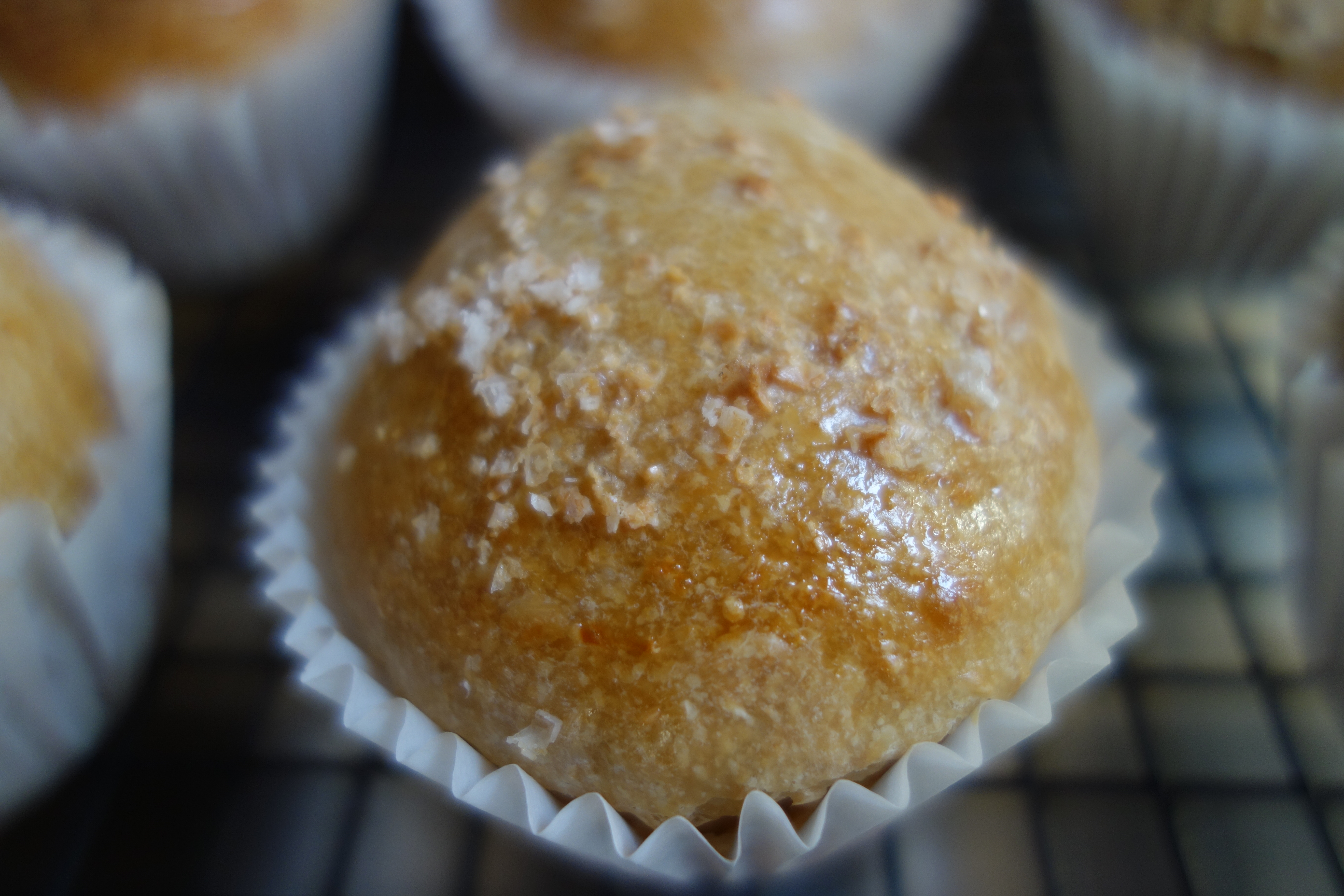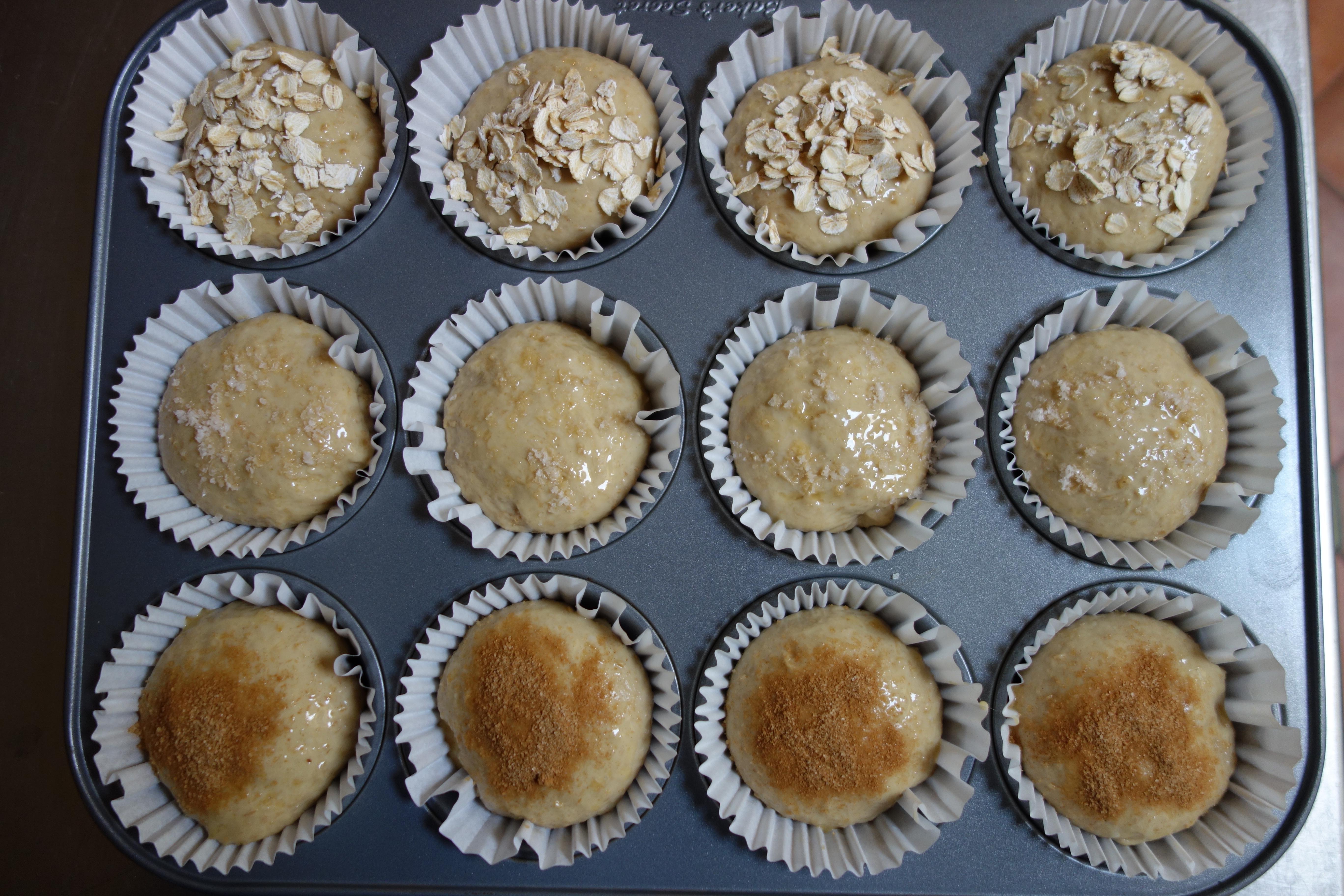 Combine flours and sugar in a large bowl and make a well in the centre. Tip water into the left over starter’s container, with the molasses, and stir to dissolve, then pour into the well in the flour bowl. Stir vigourously to form a sticky dough; cover and stand at room temperature over night. Early next morning, oil a section of bench top and scrape dough from bowl onto the slick surface. With oiled hands, stretch and fold dough once or twice, before dividing dough into twelfths. Shape each portion into a ball and slide into an oiled muffin tray cup. Cover and rest for about an hour. Pre-heat oven to 200°C. Brush each bread with a little beaten egg and sprinkle with a pinch of topping (for example: cinnamon sugar, salt flakes or rolled oats). Bake for 20 minutes or until puffed and golden. Enjoy while still warm with butter and jam and hot tea. | |