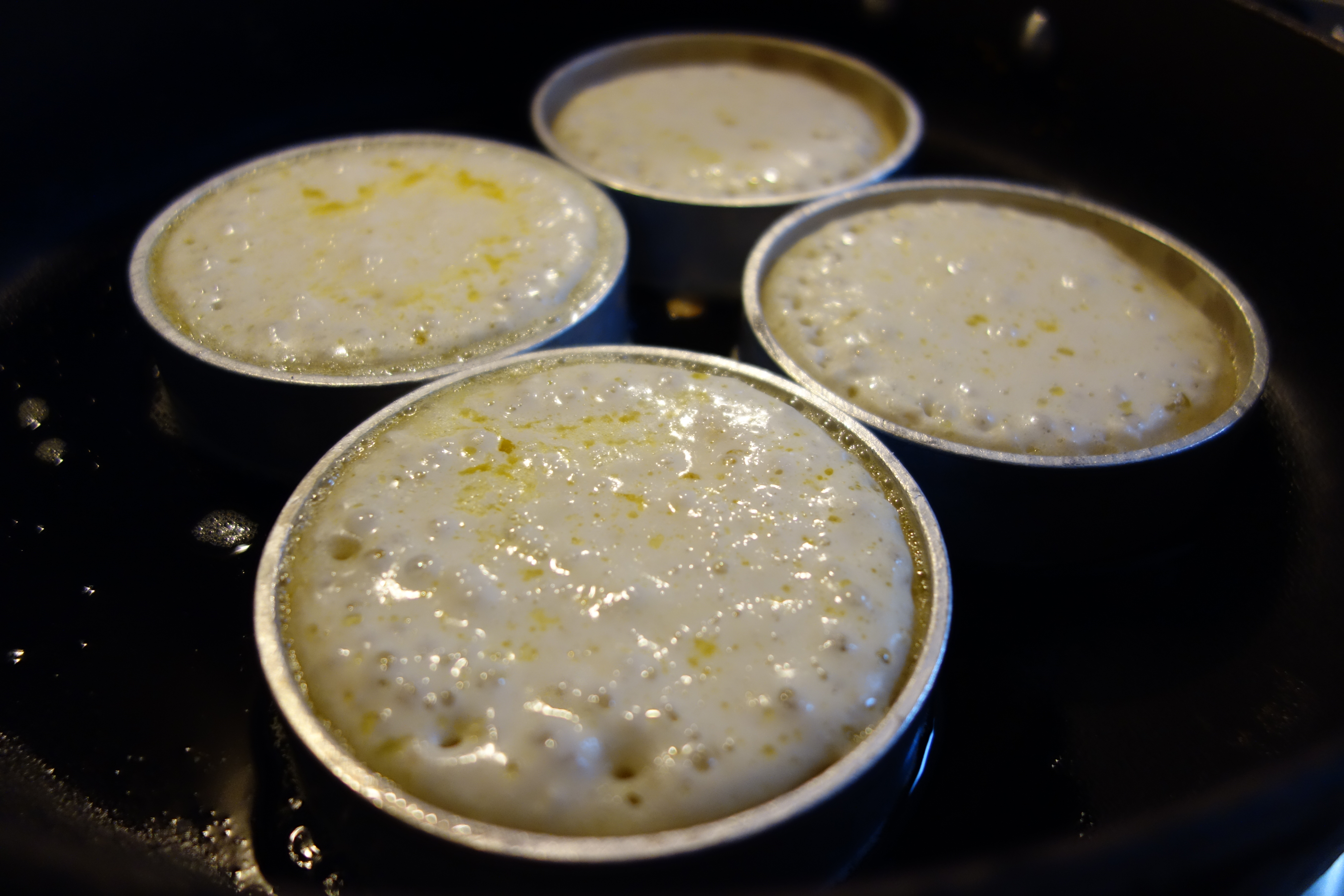 Warm a frying pan and buttered, ten centimetre crumpet rings over medium-low heat. Add about a quarter of a teaspoon of butter to each ring, wait for the butter to foam, then as the sizzling subsides, half-fill each ring with batter. Cook until small holes form on top of the crumpet, and the mixture sets in the middle. If the pan is too hot, the crumpet bottoms will burn while the centres will still be raw. If the pan is too cool, all the bubbles will escape before the batter sets and you’ll be left with flattened pancakes. If you are unsure or impatient, you can flip the crumpets and toast both sides in the pan. However, patience will be rewarded with a crisp base, soft top, and well-risen crumpets. Serve with butter and jam or vegemite.