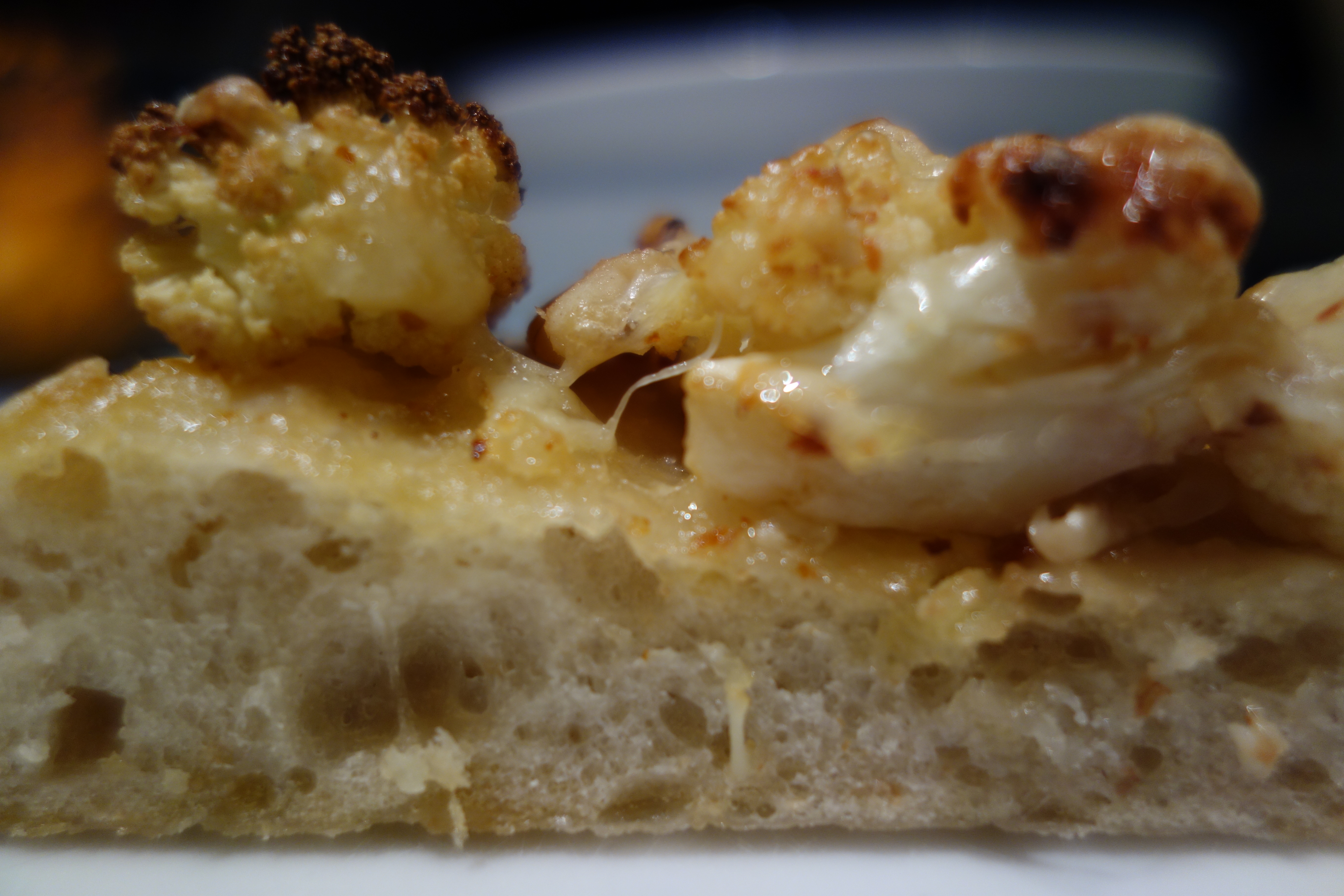Separate half a cauliflower into florets, toss with a little olive oil and a teaspoon of dried chilli flakes, spread on lined baking tray, then roast for 15 to 20 minutes at 220ºC (alongside the baking crust). The cauliflower is ready when its edges are crisp and starting to brown.