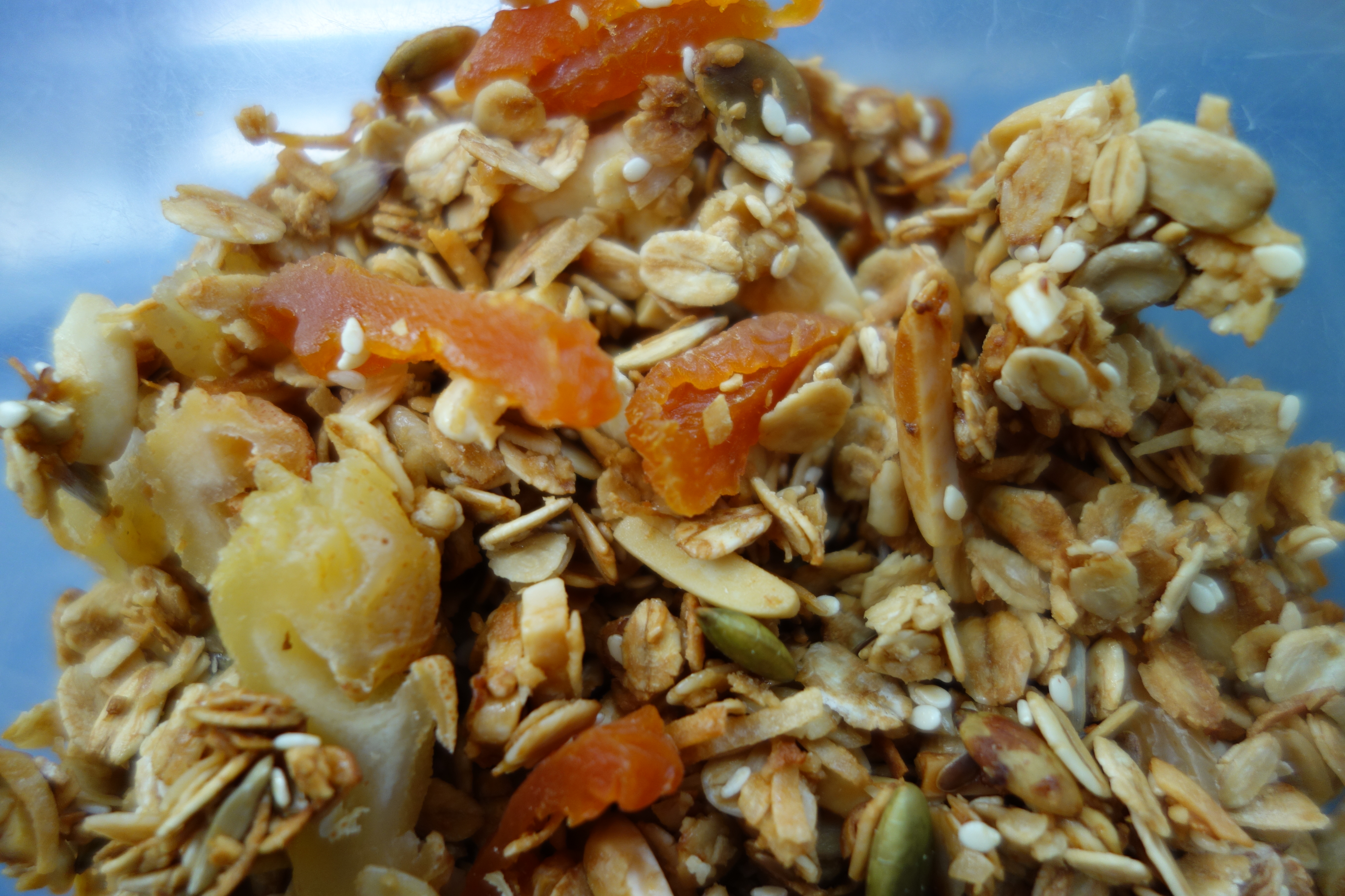 Have been baking a batch of Honey-toasted Fruit Muesli almost weekly. Varied the seeds and fruit added to the mixture; including dried apricots and pears, pepitas and a Kaipseed blend comprised of sesame seed, linseed, poppy seeds and sunflower kernels.