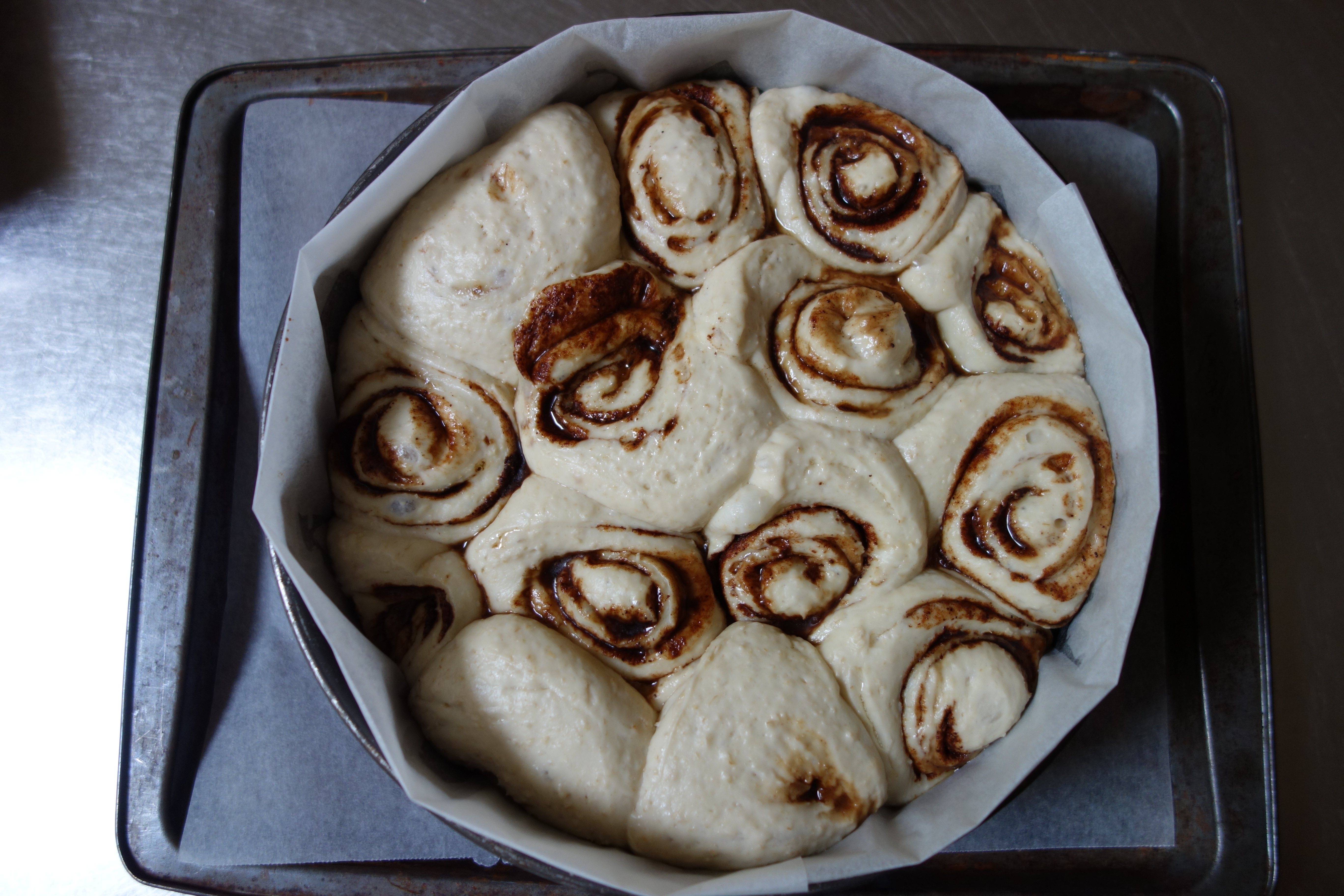 Line a 24cm (9 inch) round cake tin with baking paper and dribble a little oil in the base. On a lightly floured surface, stretch dough into a rectangular shape with a 42cm edge, sprinkle with combined sugar and spice. Roll dough into a log, dusting off as much flour as possible. Slice log into 3cm disks, and each slice arrange in the prepared tin. As each scroll goes into the cake tin, flip it in the oil in the base of the pan so that the top of each scroll is covered with a thin film of oil. Cover cake tin and leave scrolls to raise at room temperature overnight.