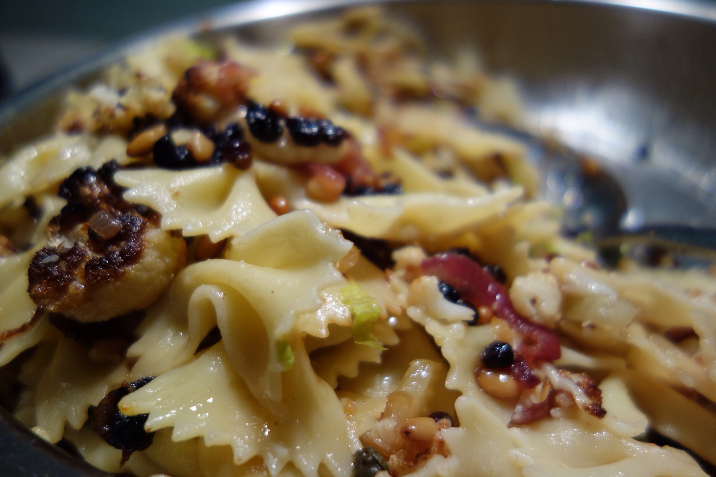 Borrowed flavours from Roasted cauliflower gigli with pine nuts and currants to make a pasta dish that makes up for all the vegetables missing from holiday meals. Seed and slice 2 jalapeño chilies, bruise and slice 4 garlic cloves, and steep in approximately a third of a cup of oil in a large bowl. Break a whole cauliflower into florets, dropping into the large bowl as you go. Toss gently, then spread cauliflower, garlic and chili on a large baking tray then bake for about 30 minutes at 200 degrees C or until browned and crisped (stir the florets after about 15 minutes to prevent those on the outer edges from burning). Meanwhile soften two sliced red onions and 4 diced celery sticks in a little olive oil, continue to cook until the vegetables take on a little colour. In a separate pan toast a large handful of pine nuts in a little oil. When nuts are browned, remove pan from heat, add a large handful of currants, a quarter cup of white wine vinegar, about 2 tablespoons of capers, and set aside. Prepare 1 packet (500g) bow-tie-shaped pasta according to packet directions. Drain pasta, toss with all other ingredients and garnish with some finely sliced celery leaves.