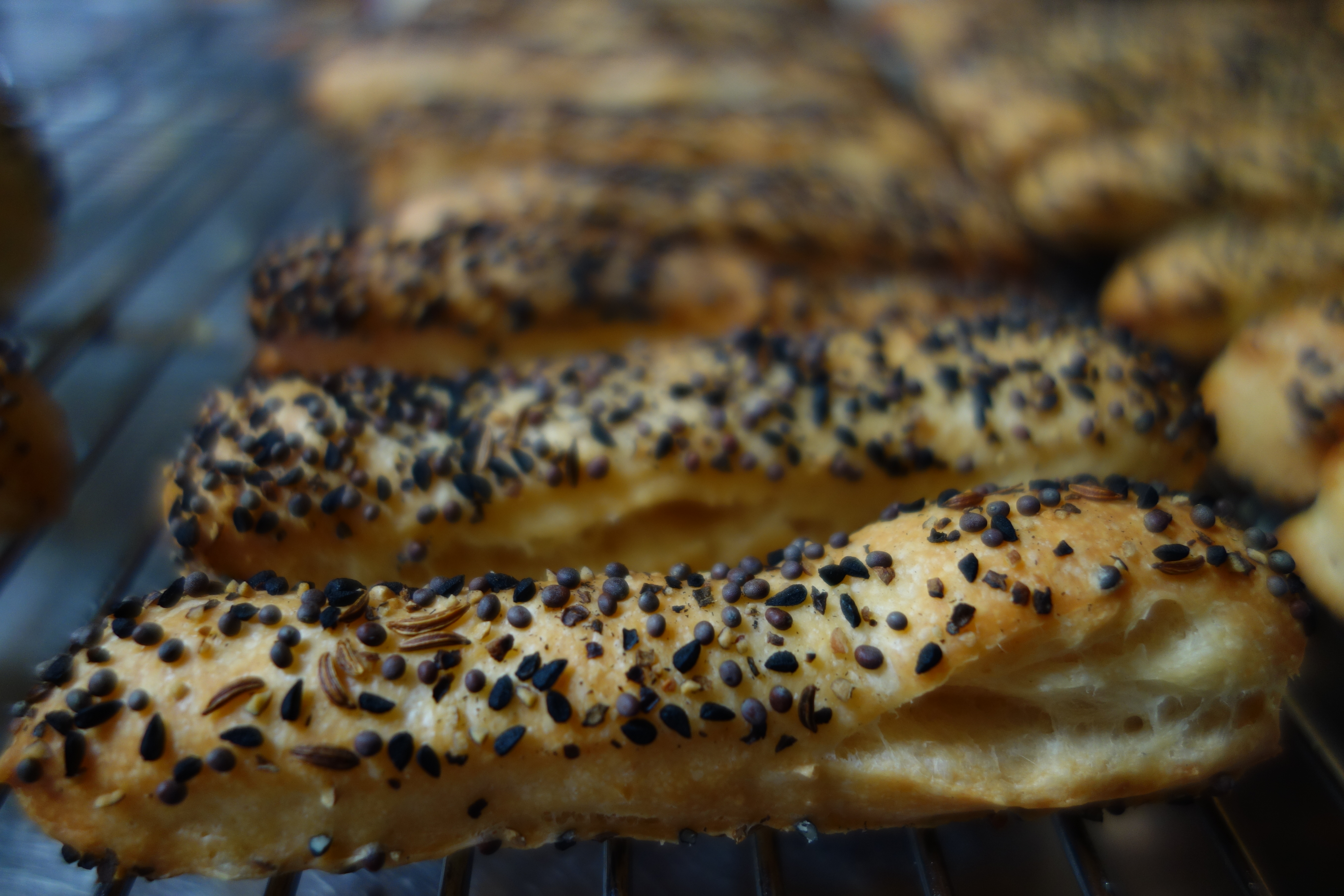 Wanted something savoury and crunchy to serve alongside a glass of wine at the book launch, and thought grissini might be nice. Started with a batch of sourdough starter from the new regimen, using the leftover leaven from the weekly pizza bake. Vigourously stirred 500 grams of bread flour, 350 millilitres of water, and the starter to make a sticky dough. After a quick knead on the oiled benchtop, left the dough to rise overnight at room temperature. Separated the dough into two balls the following morning, coated with each oil then rolled each ball in seeds (about a quarter cup each of caraway, fennel, brown mustard, nigella, & poppy seeds) and cracked pepper (about 2 teaspoons – go easy on the pepper). Rolled each ball of dough into a rectangle roughly 1 centimetre thick. The seeds prevented the dough from sticking to the rolling pin, and the rolling action embedded the seeds in the crust of the dough. Used a pizza cutter to slice lengths roughly 1 centimetre wide and 5 centimetres long, and arranged the sticks on three large, paper-lined baking trays. Rested the grissini for 30 minutes, before baking at 200°C for 25 minutes, shaking, rearranging, and turning occasionally so the strips baked evenly, then cooled on wire racks.