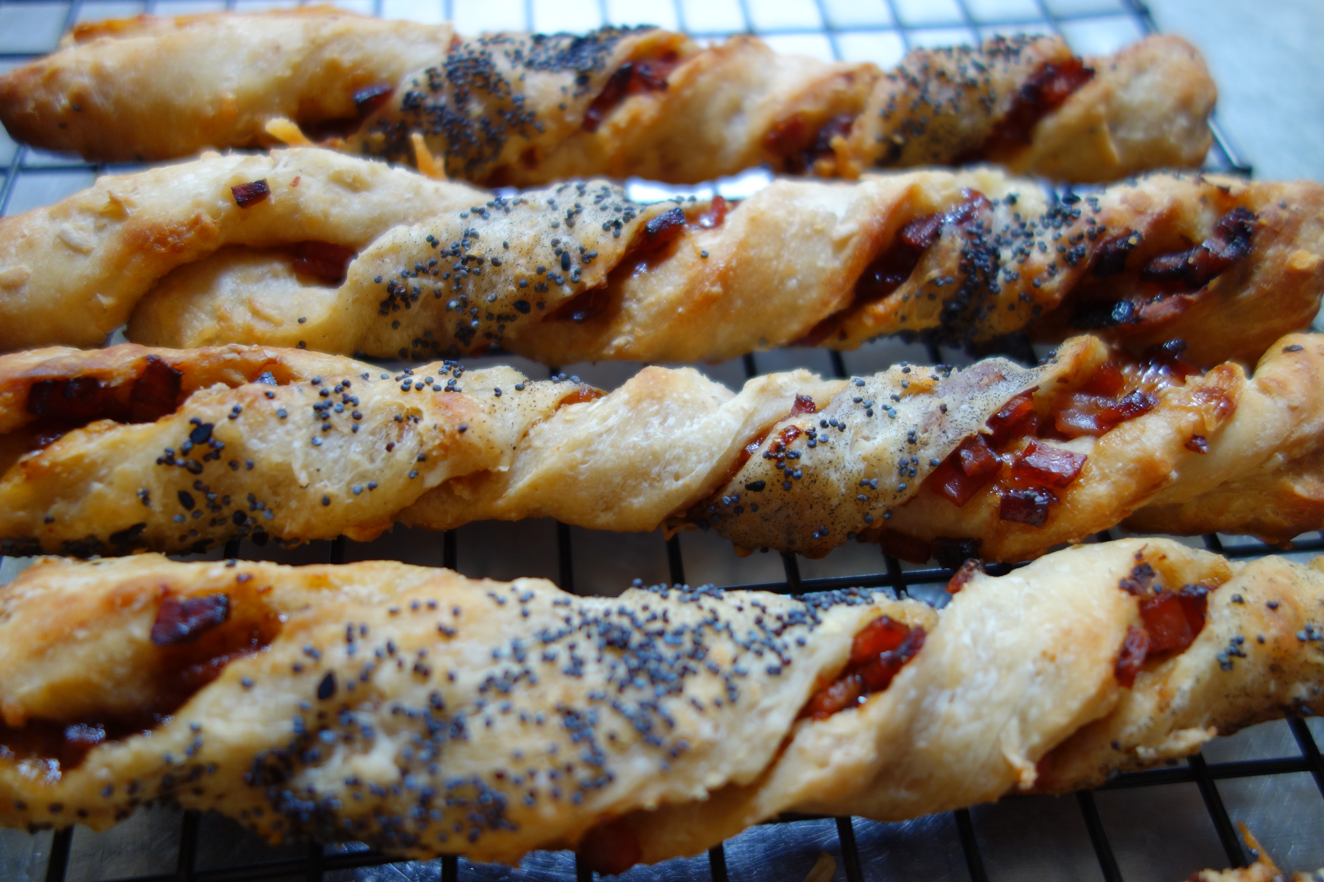 Slicing up dough with a pizza cutter makes short work of the shaping phase of a batch of sourdough. While making grissini for the book launch, imagined how the cutter might be useful for other recipes. Originally thought these breakfast grissini would make fantastic dippers for soft boiled eggs, but they were just fine on their own. Oiled the workbench and stretched a batch of breakfast scroll dough into a rectangle roughly 25 by 40 centimetres and about 1 centimetre thick; did not want to roll it and squeeze out the air pockets. Squirted barbeque sauce in a scribbly pattern over half of the oblong, and scattered over four finely chopped and crisped bacon rashers. Folded one half of the dough over the other (making a 20 by 25 centimetre rectangle). Patted some poppy seeds onto the surface of the dough, then cut it into 1.5 centimetre strips. Twisted each strip while arranging them on paper-lined trays, and rested the grissini for about 30 minutes. Baked at 200°C for 15 minutes, rolled each stick over, sprinkled each with some finely grated parmesan, then baked for a further 10 minutes.