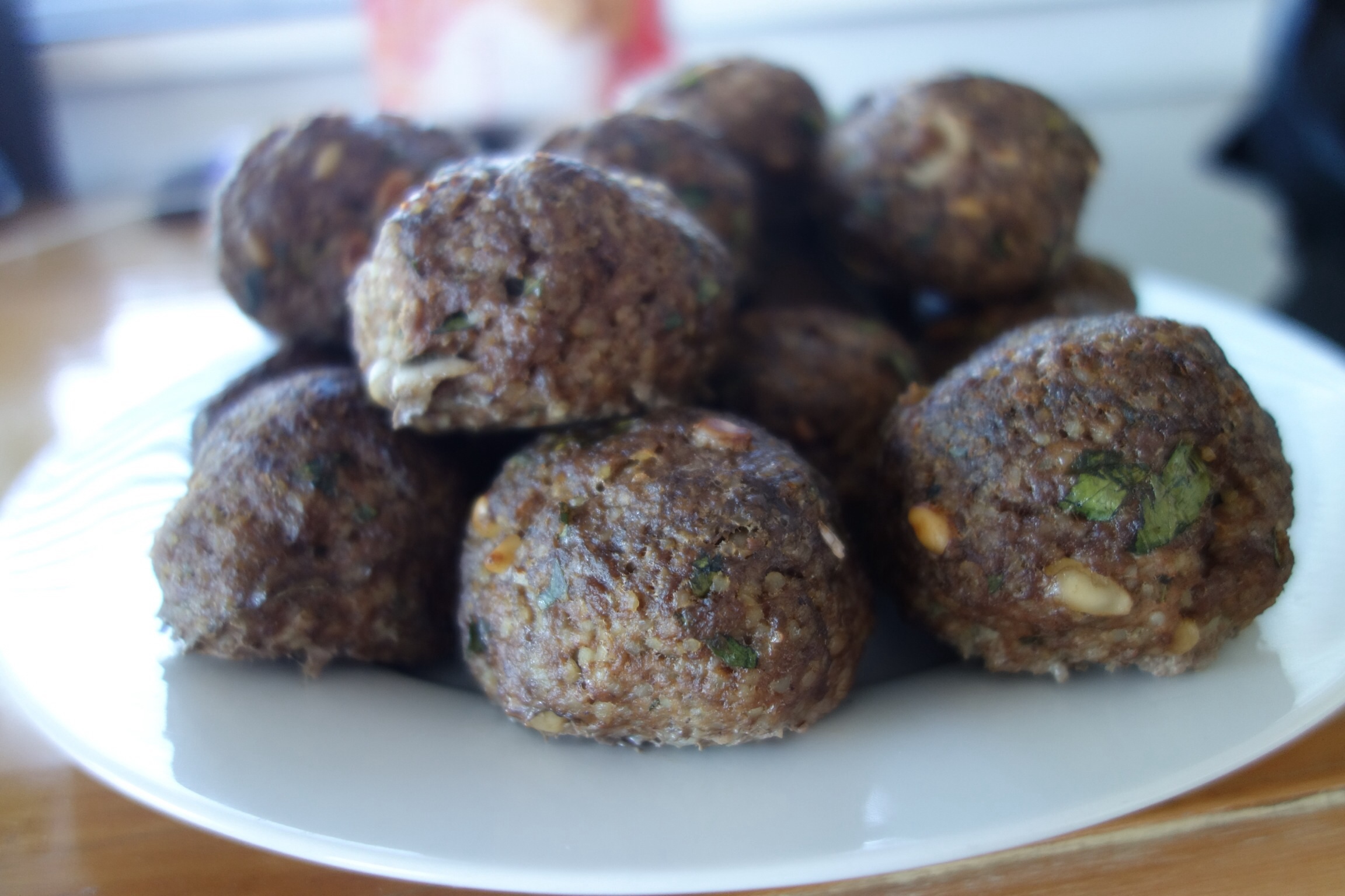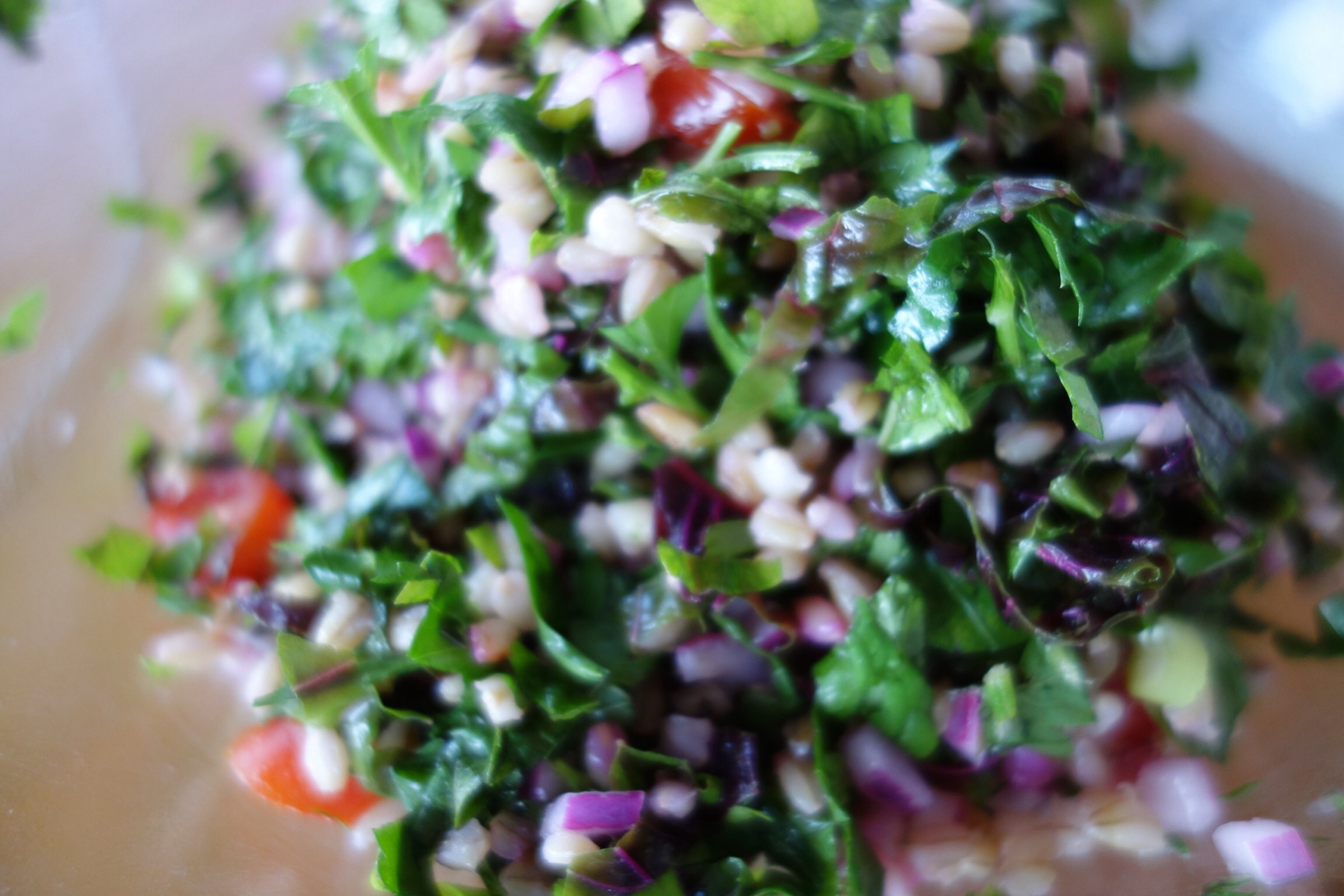 Alongside the purple cauliflower at the market was a bunch of brilliantly coloured spinach which made its way into our farro salad we had with dinner. Chopped it finely and added it to the pot of simmering grains so as to blanch it in the final minute of cooking time. Also served the bulgur meatloaf shaped into meatballs (added an egg to bind the mixture) and roast cauliflower.