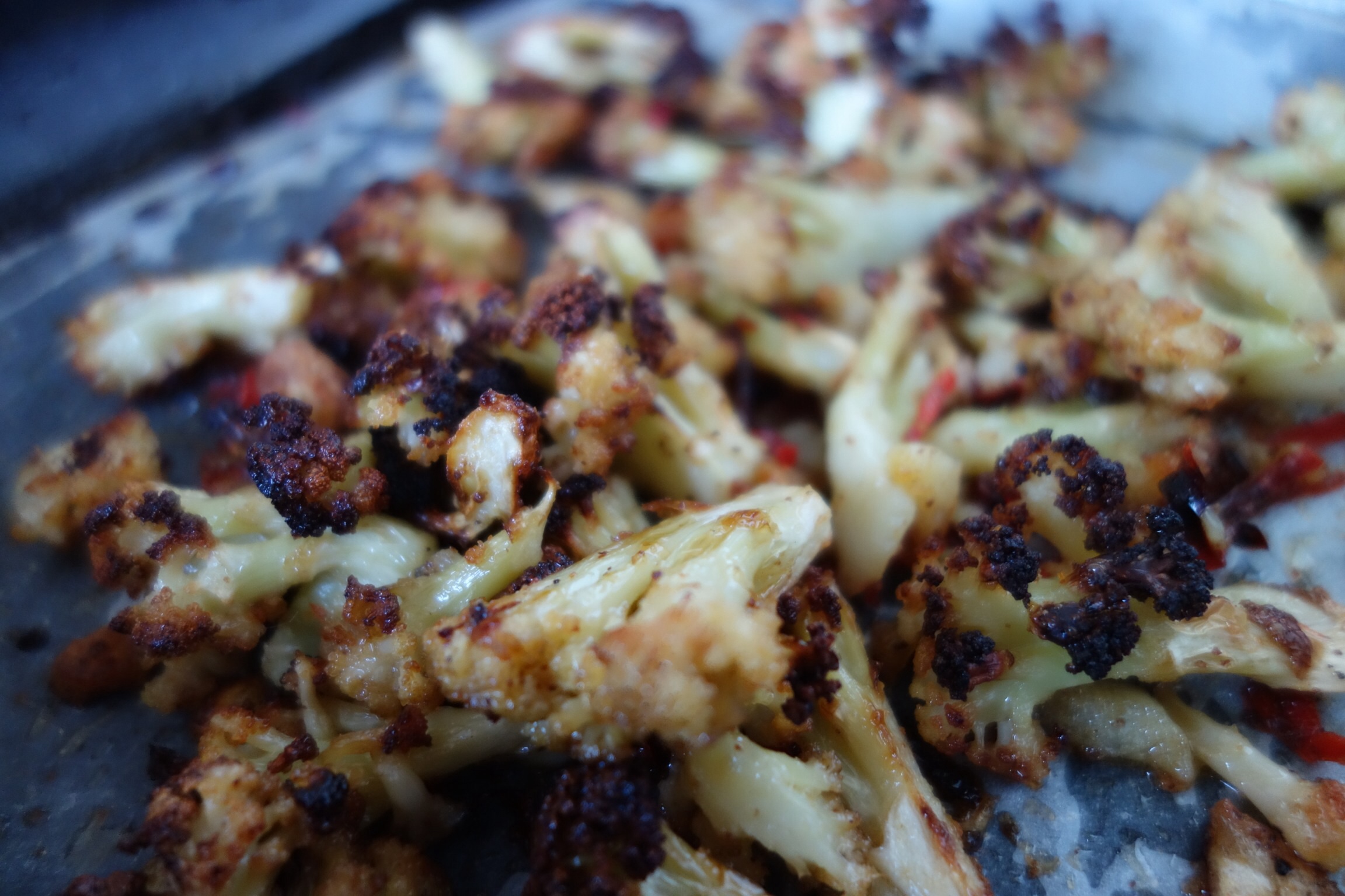 Picked up an amazing purple cauliflower at Ulverstone’s Farmers Market which crisped up nicely after being broken into florets and tossed with three finely sliced cloves of garlic, a seeded and finely sliced, long, red chilli, a teaspoon of onion powder, and a drizzle of olive oil. Roasted at 200ºC for about 40 minutes, stirring every 10 minutes or so, until bronzed and crisp.