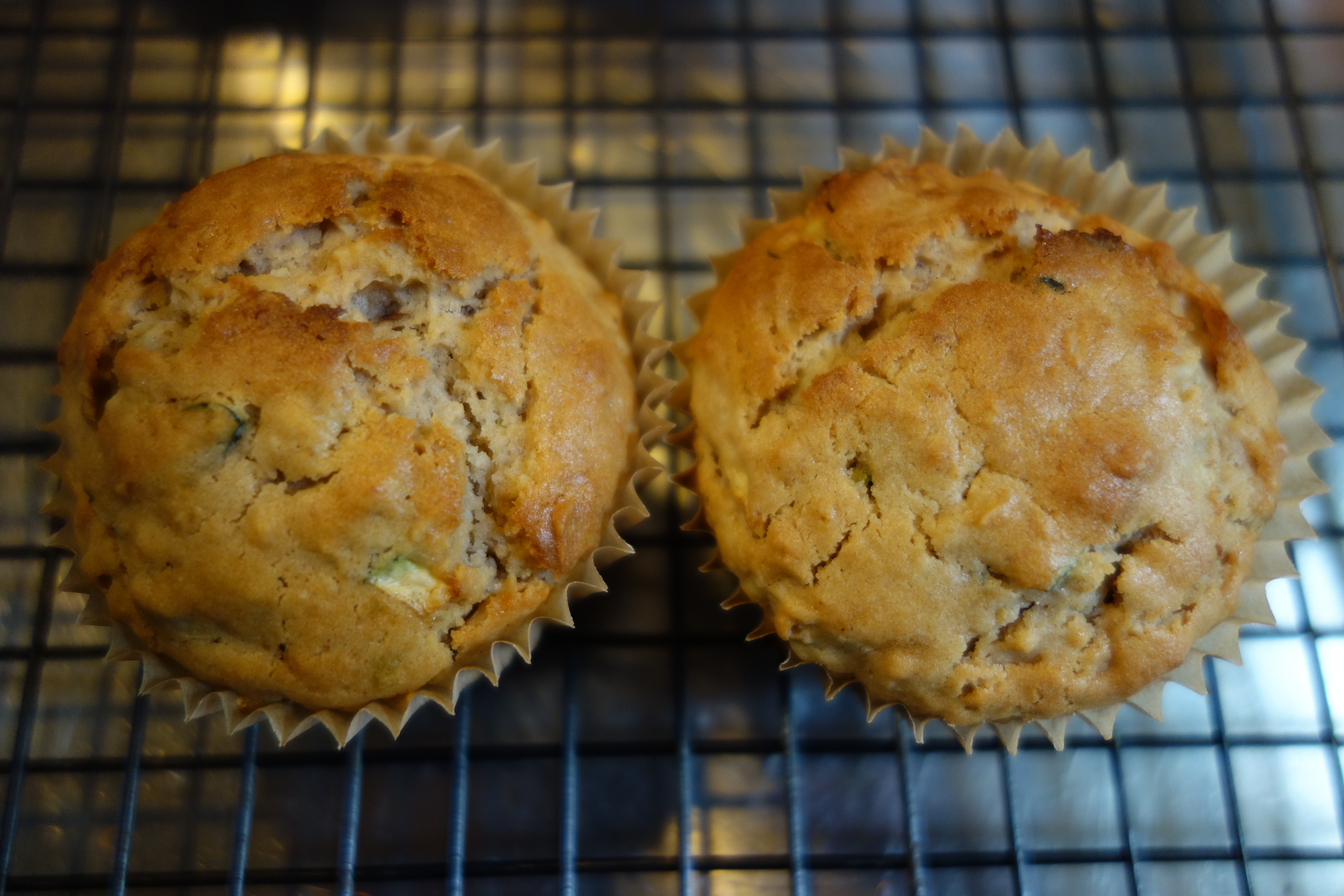 | Whisk egg into milk and butter, then pour the lot into the well. Mix wet and dry ingredients together with a spatula until barely combined. Use an ice-cream scoop to fill 12 paper-lined cups of a muffin tray. Set oven to 200ºC, and allow raw muffins to stand while the oven heats up. | Stir 1 cup of coarsely grated zucchini and a dribble of vanilla extract into the jug. | Top each muffin with a miniature pretzel. | |