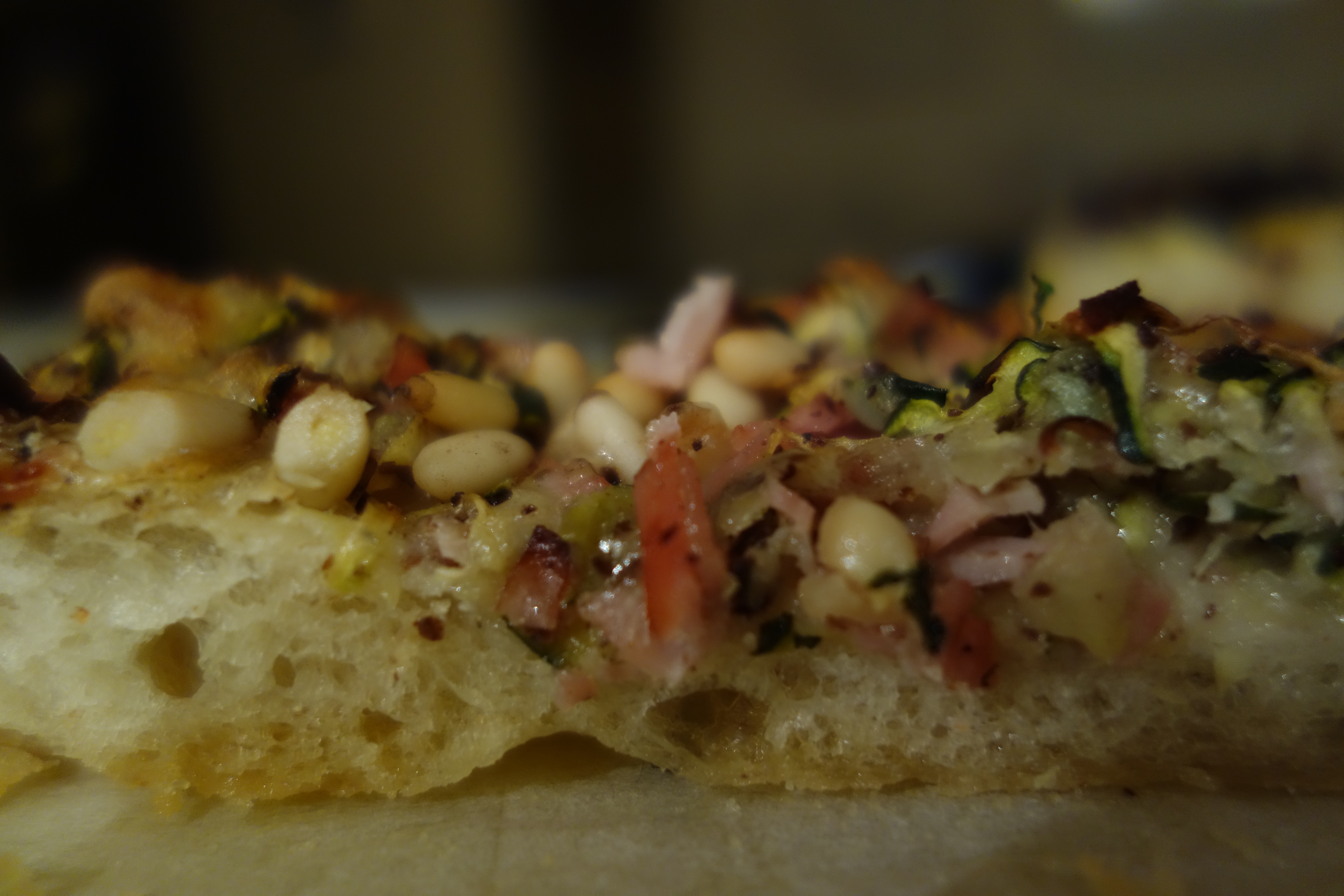 Converted the tail of an enormous zucchini into a topping on this week’s pizza. Grated enough zucchini to make two large handfuls and tossed with 2 teaspoons of salt. Allowed the strands to drain for a half hour, and then rinsed and spun them in the salad spinner. Tossed the zucchini with equal volumes of grated provolone and finely sliced ham, a teaspoon of powdered, dried sumac and a clove or two of garlic filed on the microplane. Spread this mixture over a partly cooked, white pizza base, sprinkled with a small handful of pine nuts, then baked for another 15 minutes at 200°C until the cheese and nuts were golden.