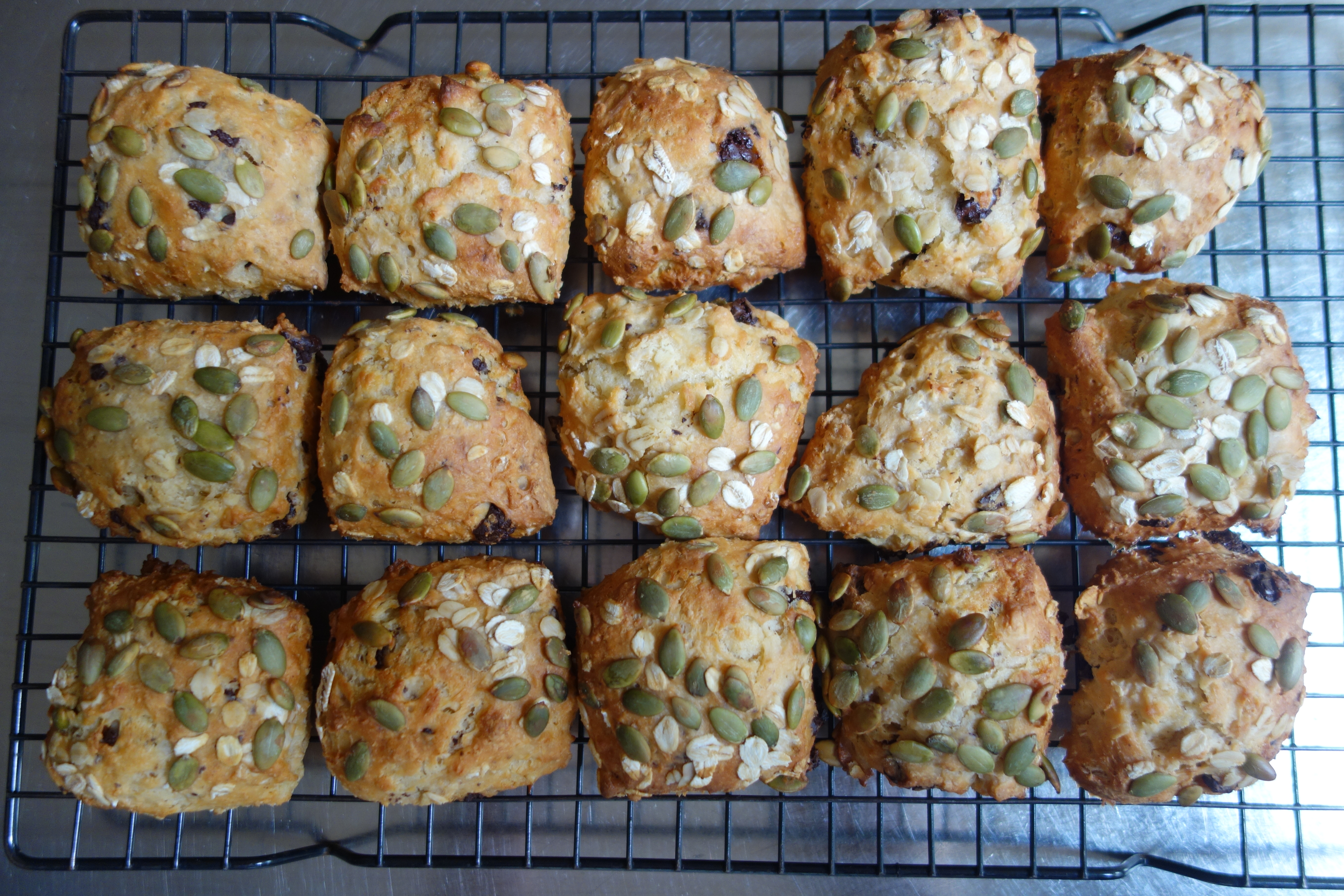 Am a big fan of both Stephanie Alexander and her nutty, oat and chocolate flavour combination. Made a batch of scones that borrowed inspiration from her chocolate and pumpkin seed biscuits, and Bon Appetit’s cheddar-walnut recipe. Added a half cup each of chopped dark chocolate and rolled oats to the dry scone ingredients, skipped the sugar, walnuts, and cheese, and substituted about three-quarters of a cup each of greek-style yoghurt and oat milk for the cream. Patted a scattering of pepitas and more rolled oats onto the surface of the sticky dough to make a 20 centimetre square, then chopped it into sixteen squares. The scones baked for about 20 minutes.