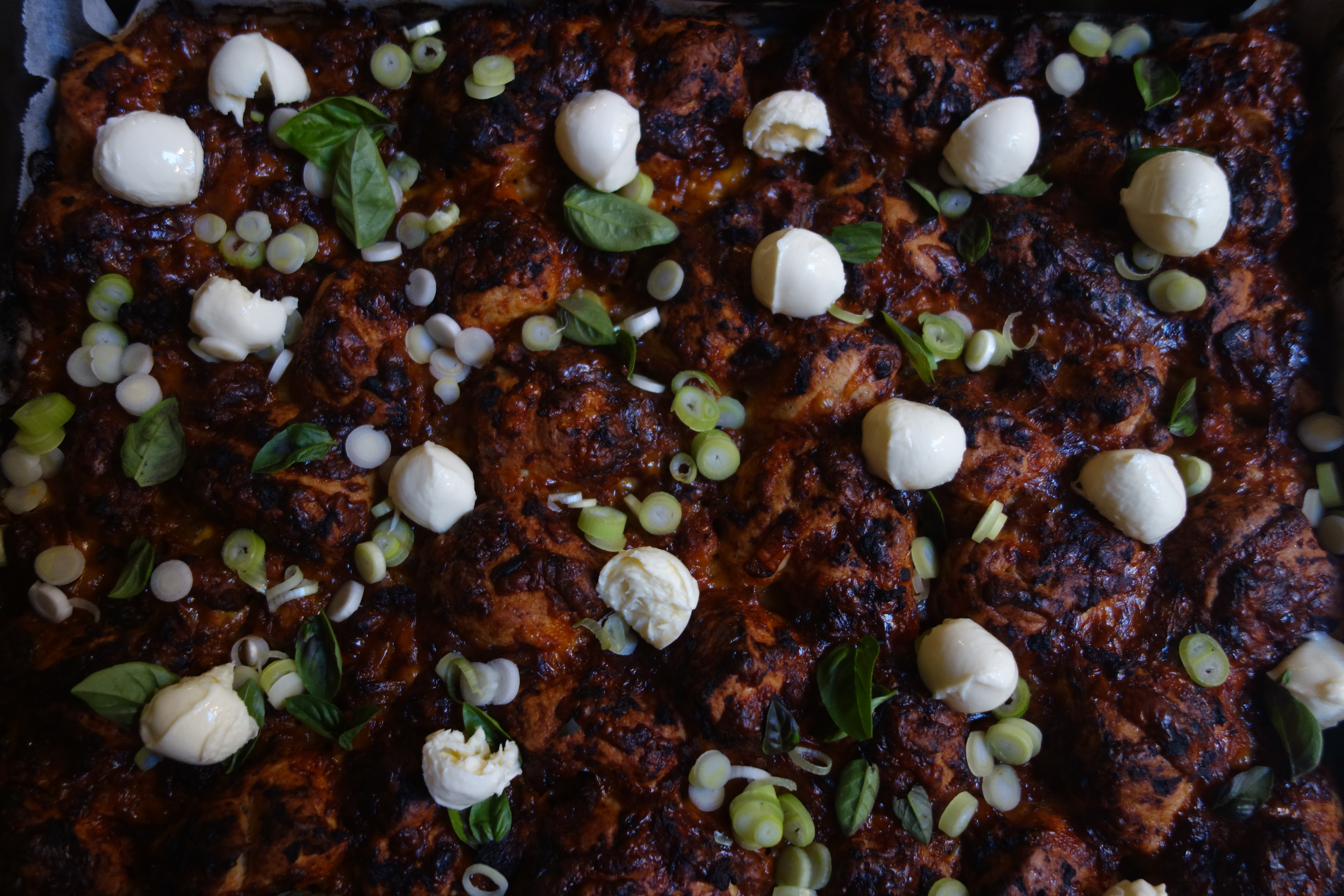 Drew inspiration from the Korean Barbecue Monkey Bread recipe to make a bolognese version. Started with 750ml bolognese sauce, 3 cups grated mozzarella cheese, 500g refrigerated, aged pizza dough shaped into 16-or-so tiny balls, and 4 sliced green onions. Tossed these onto a large baking dish, allowed dough to rise for about an hour before baking for 40 minutes at 200°C, rotating the tray at half time. Scattered another handful of sliced onion, some torn basil leaves and a dozen cocktail bocconcini over the top before serving.