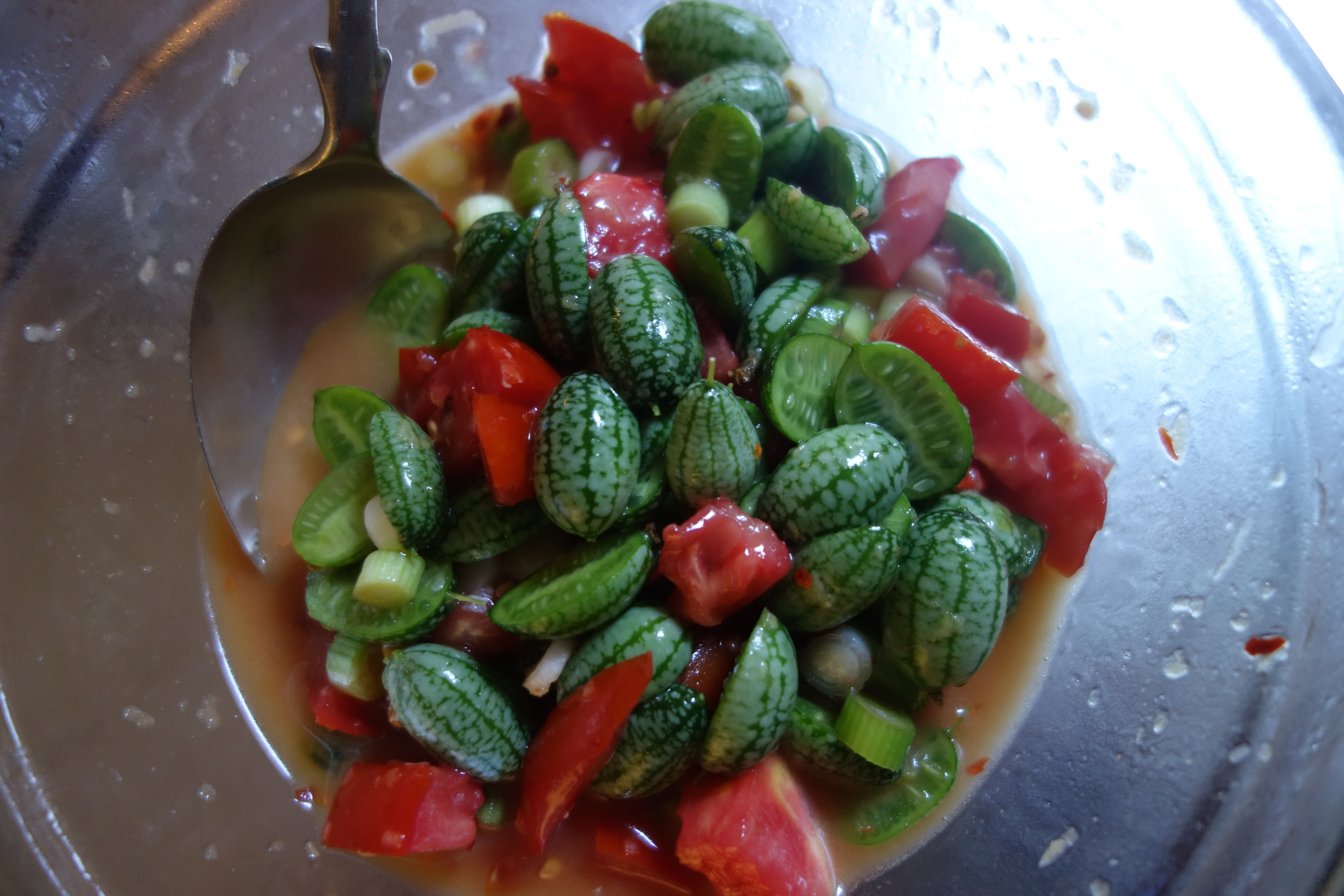 Tossed a salsa together with some chilled and halved cucamelon, a ripe, cubed, fleshy tomato, a handful of sliced spring onion, and sesame-soy-garlic dressing inspired by Chinese Smashed Cucumbers With Sesame Oil and Garlic.