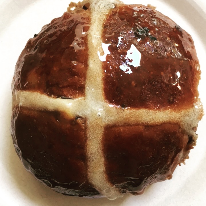 Embraced the Easter season and a warm Autumn Melbourne morning with a batch of Karen Martini’s Hot Cross Buns. Made the dough in the KitchenAid – holding back a 100g or so of flour to prevent the mass from climbing out of the bowl. Added the last of the flour along with the 100g each of currants and sultanas, then let the dough rest overnight in the fridge. Shaped 16 buns and let them prove while going about Saturday morning business. Made a loose cross-batter from half a cup of flour, a good grind of salt, and a half dozen soupspoonfuls of water. While the buns baked, boiled half a cup of golden caster sugar with three quarters of a cup of water, and a pinch of allspice to make a syrupy glaze. Brushed the buns with the syrup while still hot.